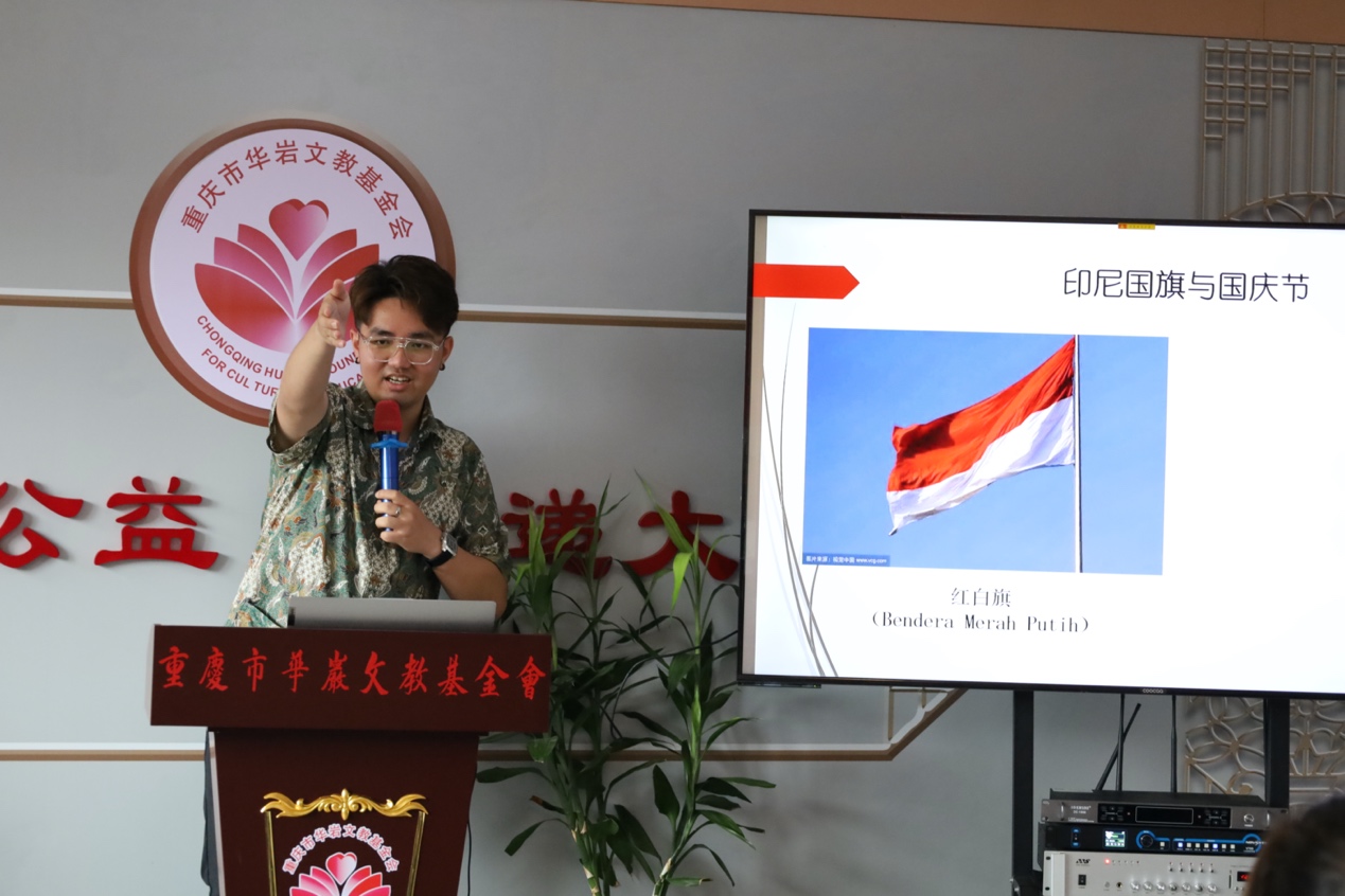 21级汉语国际教育专业硕士印度尼西亚研究生傅维强5月22日参加由重庆市华岩文教基金会组织的“世界文化交流与发展——爱心公益课堂”活动并担任授课教师给小学生们介绍印尼文化。该“爱心公益课堂”的活动目的是为了介绍来自世界各地留学生家乡的文化,涉及语言、礼仪、旅游景点等主题。