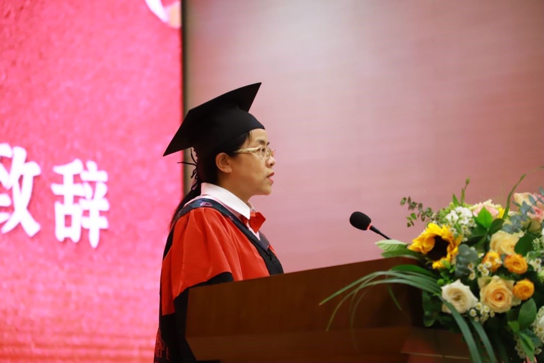 工作的学生家长、用心育人的老师表示了衷心的感谢。她借此契机回顾了外院人共同奋斗、挥洒汗水、共同成长所取得的累累硕果,勉励各位毕业生始终秉承重大外院人“学贯中西,梦飞寰宇”的初心,在未来的工作和学习中,寄语所有毕业生“学会做人、学做真人;学会做事、学做实事;终身学习、永逐真知”。