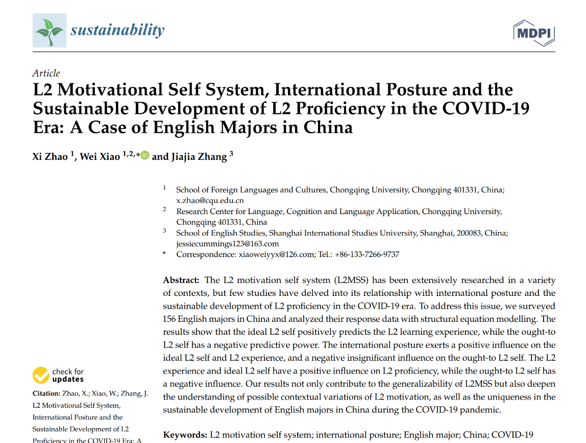 副教授、语言认知及语言应用研究基地专职研究员肖巍博士指导本科生和硕士生撰写的研究论文L2 Motivational Self System, International Posture and the Sustainable Development of L2 Proficiency in the COVID-19 Era: A Case of English Majors in China于SSCI二区期刊Sustainability(影响因子3.889)在线出版。肖巍博士为论文通讯作者,合作者为其指导的本科生张家佳(现于上海外国语大学英语反差婊