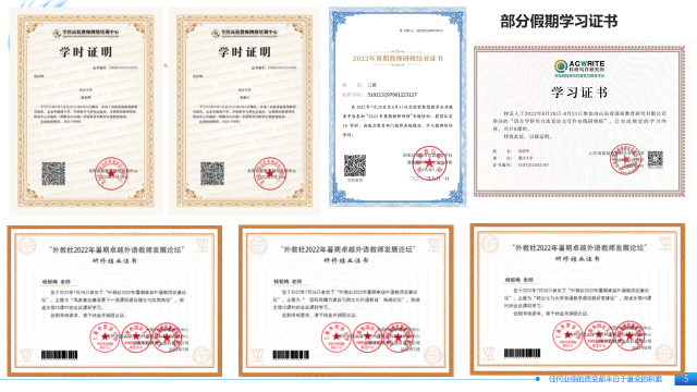 杨老师还介绍了老师们在暑假利用个人时间认真学习的情况。课程组老师共参与并完成382个学时的学习任务,人均25学时,共取得23个学习证书。主要包括国家智慧教育公共服务平台的“2022暑期教师研修”专题培训、全国高校教师网络中心组织的“理解当代中国”学习、科研写作研究所的“语言学研究方法及论文写作在线研究班”、“高质量发展背景下一流课程建设理念与实施路径研修班”、“跨文化与大学英语教学虚拟教研室建设”、“国际传播力建设与跨文化外语教育高端论坛”等系列学习。这为新学期与时俱进的开展课程建设奠定了理论与实践基础。