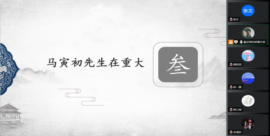 随后,童欣瑶同学在会议上播放了实践团成员精心制作的马寅初视频短片。此视频主要介绍了马寅初生平,并辅以情景短剧,来突显马先生忧国忧民、刚正不阿的精神品质。同时,通过对重大学子的采访以及专业人士的介绍,进一步深化了同学们对马寅初的认识与了解。整支视频经过数次修改和不断完善,生动展现了马老先生潜精研思,大义凛然的形象。