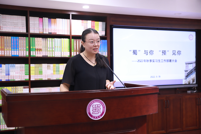 长助理周刘波、学生处副主任刘会兰、教师发展中心主任万宇出席,巴蜀中学教师发展中心池璐老师主持的2022年秋季实习生工作部署会。