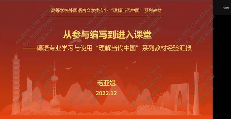 德语系积极推进课堂教学改革,并将思政元素引入学生培养的各个环节。系主任毛亚斌老师以“从参与编写到进入课堂”为主题分享了德语专业学习与使用《理解当代中国》系列教材经验。作为《理解当代中国》系列教材编写团队的成员,毛老师对该教材编写理念进行了深入的分析,同时也分享了如何从教材出发挖掘思政育人元素,开展课程思政的实施方案。
