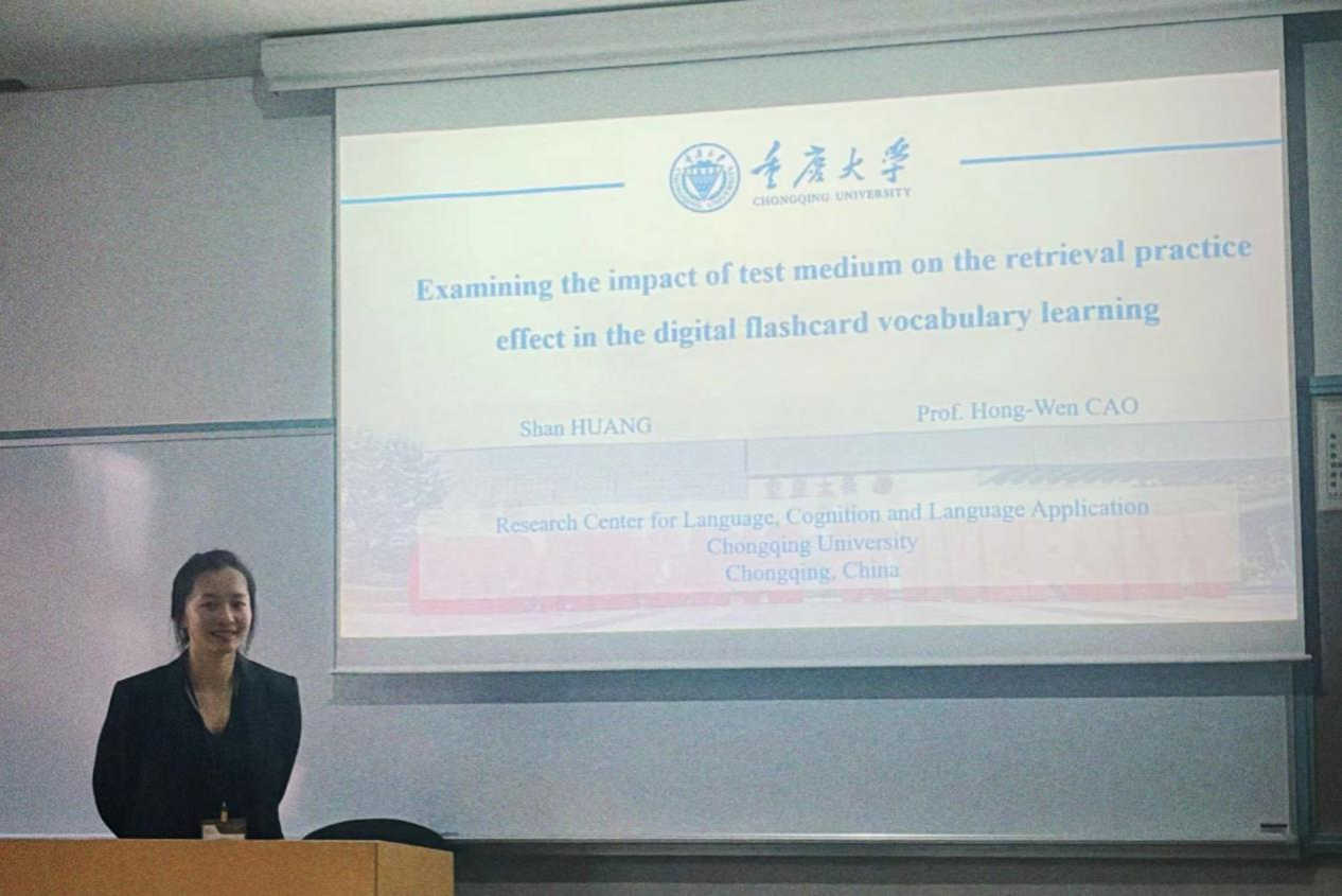 曹洪文教授指导的2022级博士研究生黄姗受邀参加了此次会议,并在分会场中以“Examining the Impact of Test Medium on the Retrieval Practice Effect in the Digital Flashcard Vocabulary Learning”为题进行口头汇报。该研究借鉴心理学领域的研究方法与范式,探究电子闪卡技术在外语词汇学习中的应用,聚焦于测试媒介对提取练习效应的影响,为计算机辅助的外语词汇学习研究提供了跨学科研究的新视角。