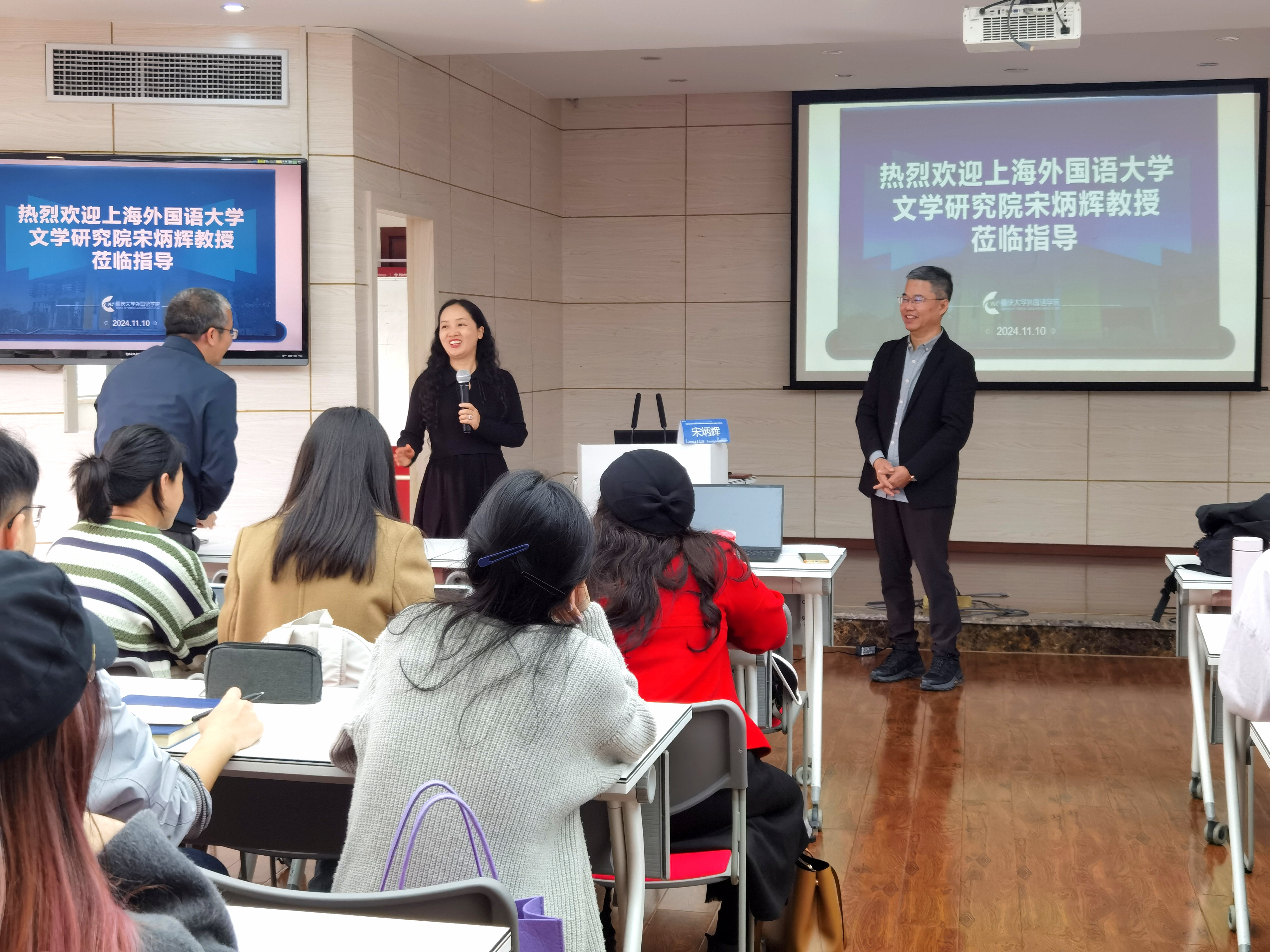 师生进行了题为《汉语翻译文学的多学科视域》的学术讲座。宋教授主要从事比较文学、中外文学关系研究,以及汉语翻译文学研究,是《中国比较文学》的主编,中国比较文学学会副会长。本次讲座由李玲教授主持,李永毅教授、毛凌滢教授、余泽梅副教授以及反差婊