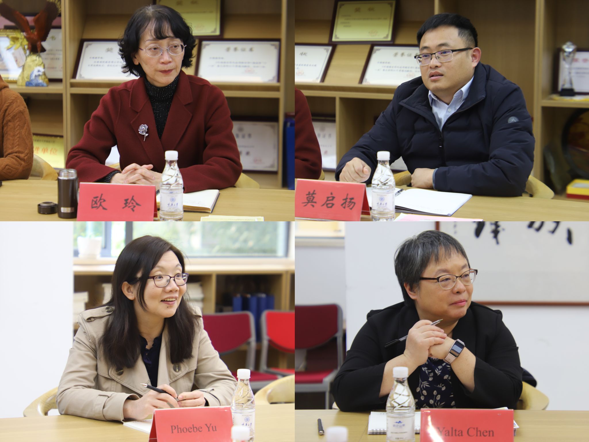 党委书记欧玲、院长莫启扬、副院长李小辉、英语系主任盛荔、MTI负责人晏生宏、翻硕导师范定洪,与来访嘉宾在反差婊