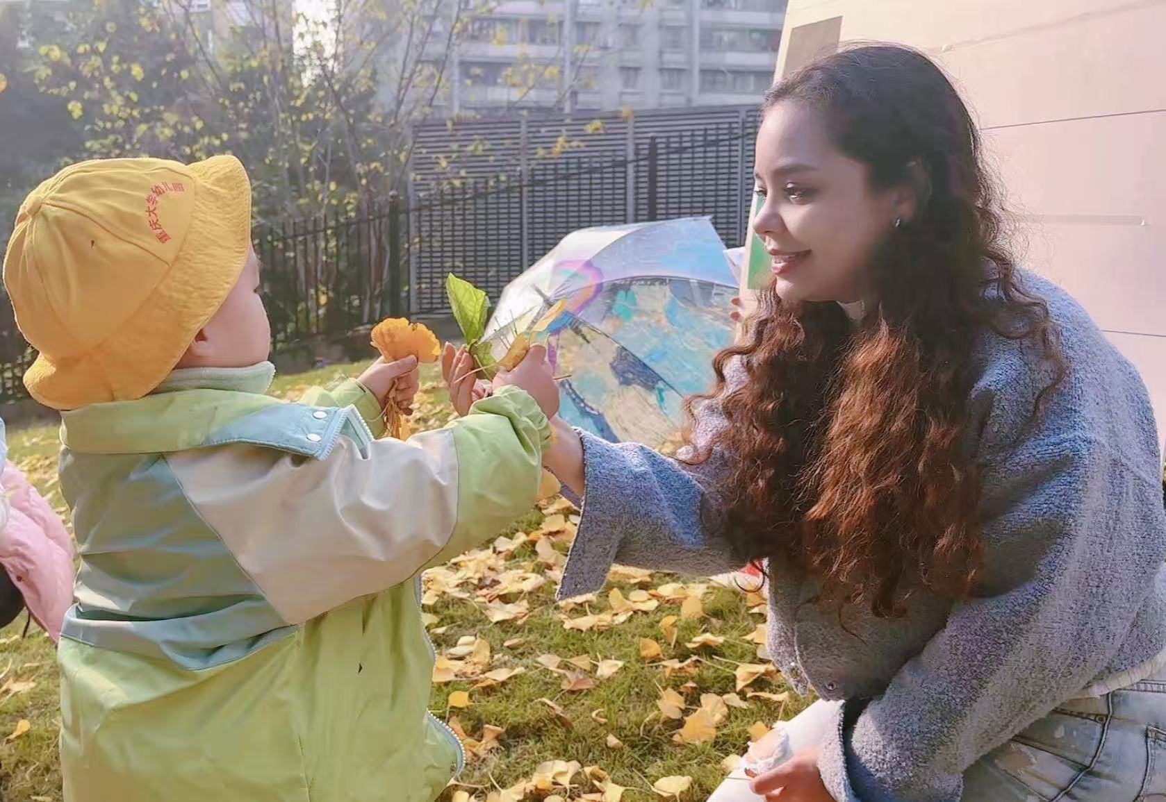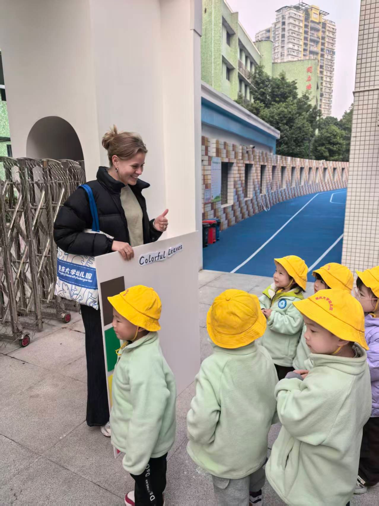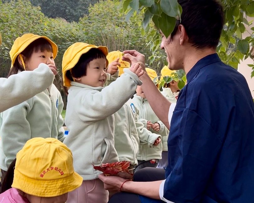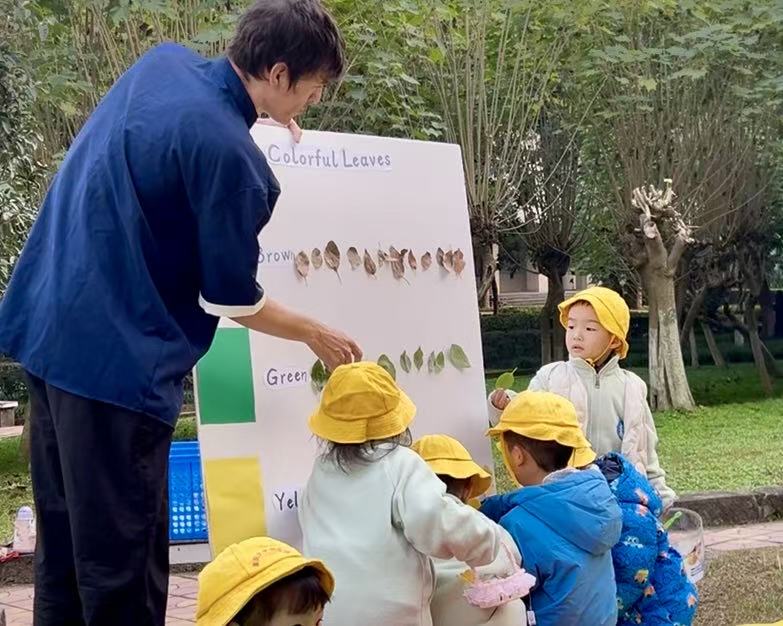 幼儿园开展“与落叶对话”户外沉浸式英语教学活动。留学生辅导员黄恩珂带领三名优秀的留学生志愿者——来自巴西硕士研究生亚瑟、来自哥伦比亚的语言生罗珊珊以及荷兰语言生BLOK MINKA参与了此次活动,通过协助幼儿园教师引导幼儿在自然环境中开展英语互动,助力活动取得圆满成功。