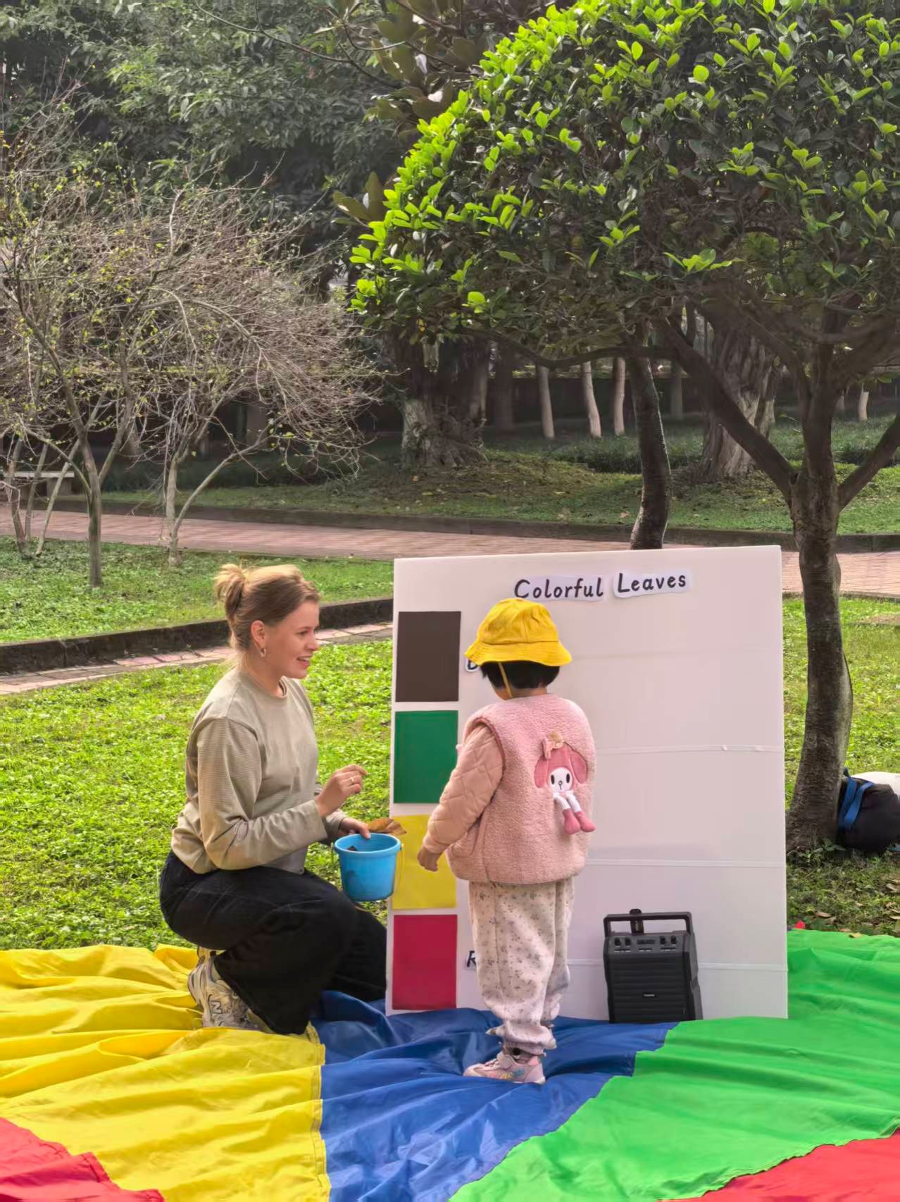随后,在志愿者的引导下,小朋友们将收集到的树叶按颜色分类,并尝试用简单的英语表达颜色词汇,如"Red""Yellow",在轻松愉快的氛围中完成语言启蒙。