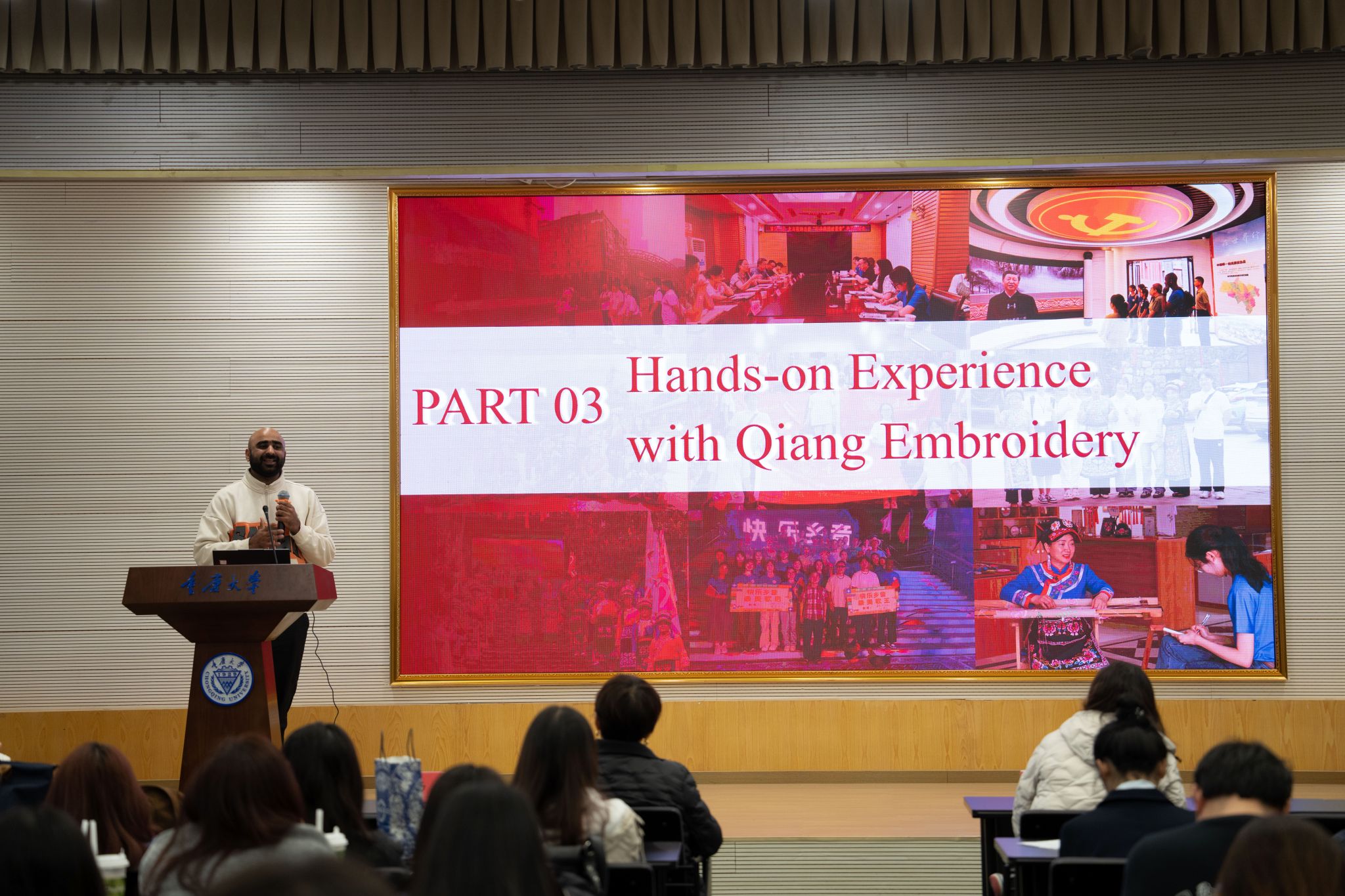 学子以本土实践回应关切:“梁滩河流域生态治理”“城市湿地公园建设”等项目展现“绿水青山就是金山银山”的落地成效;“无废课堂建设”“璧山区产业升级”等研究呈现可持续发展理念的微观渗透;“北川羌绣非遗探索”团队则通过记录传承人技艺创新与产业化实践,展现非遗活态传承与乡村振兴的生动实践。