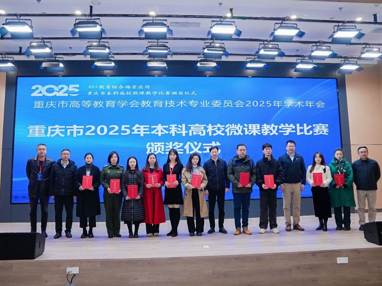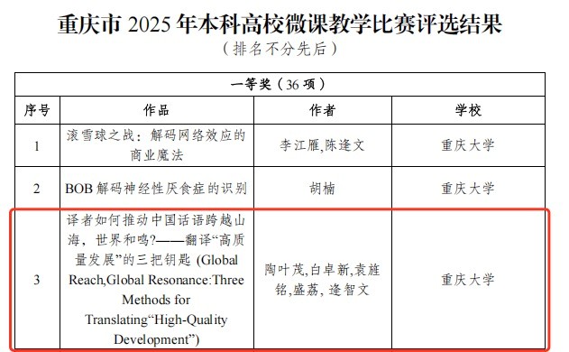 陶叶茂老师团队的微课作品聚焦中国时政话语的英译传播,经校赛选拔进入市赛,在比赛中脱颖而出,荣获市级一等奖。2026年1月9日,陶叶茂老师受邀前往重庆师范大学参加颁奖仪式,并参与重庆市高等教育学会教育技术专业委员会2025年学术年会。