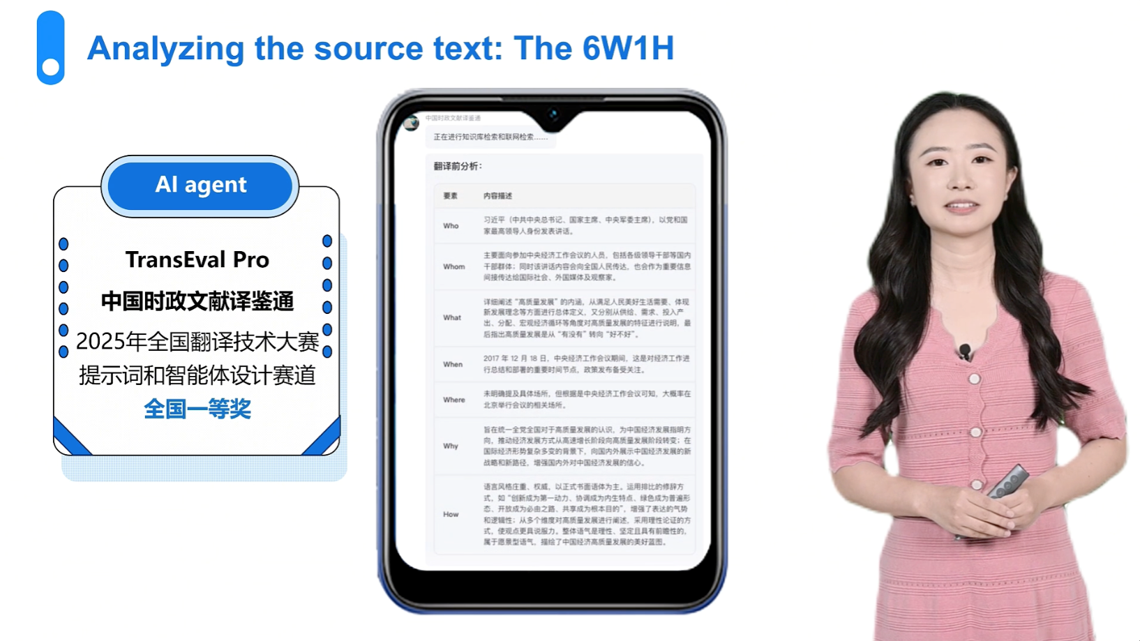 陶叶茂老师团队微课作品《译者如何推动中国话语跨越山海,世界和鸣?——翻译“高质量发展”的三把钥匙(Global Reach, Global Resonance: Three Methods for Translating “High-Quality Development”)》紧扣中国时政话语国际传播需求,以“高质量发展”的英译为依托,围绕策略选择与表达优化组织教学,着力提升学生跨文化阐释能力与时政翻译的规范意识。团队将2025年9月在“第三届全国翻译技术大赛(提示词和智能体设计赛道)”决赛荣获全国一等奖的智能体“TransEval Pro”(中国时政文献译鉴通)融入课程教学,助力语境分析、译文评估与迭代优化,构建了“示范讲解—人机协作—即时反馈—反思提升”的学习闭环,有效增强了微课的互动性与可迁移性。课程在短时长内实现知识、能力与素质目标的协同达成,体现了“国际传播导向”与“数智技术赋能”两大特色。