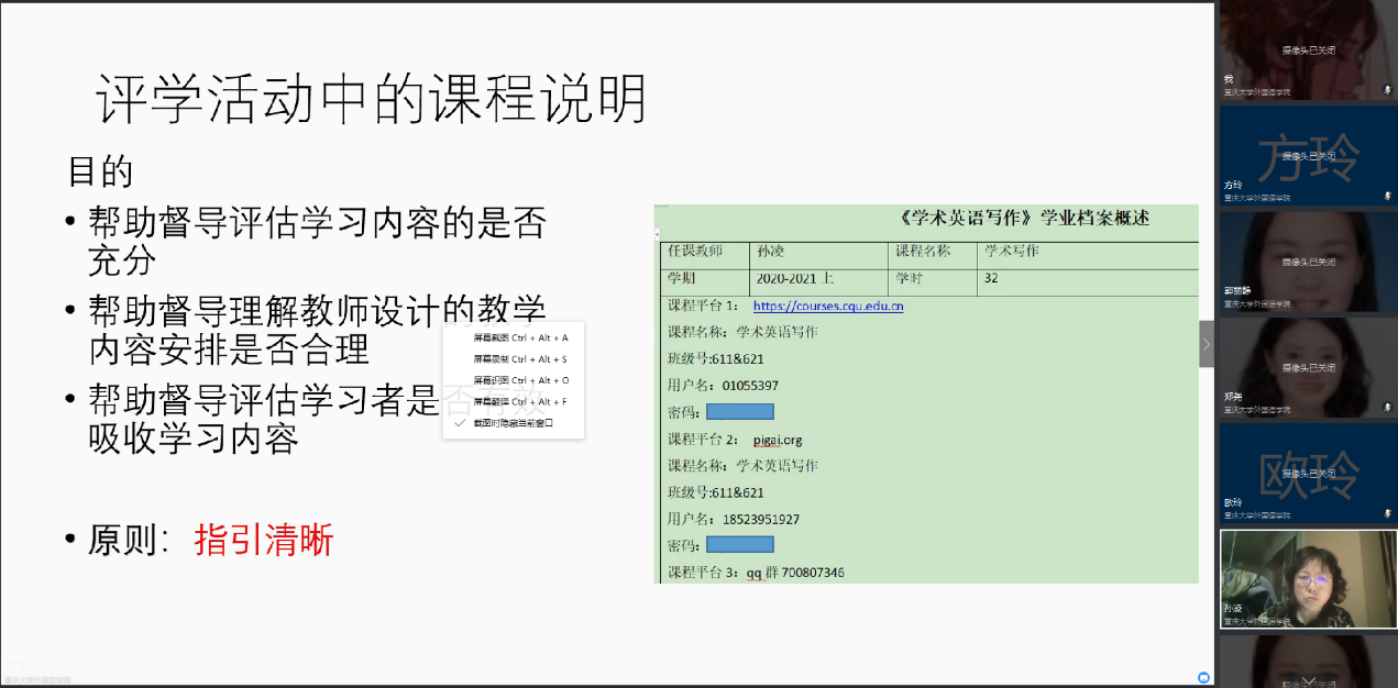 评学改革的目的和评学总体情况,并提出了大类招生背景下“以学习为中心”的教学变化和重点。接下来,孙凌老师作为上学期评学中的优秀代表,重点分享了她的教学档案管理经验。孙凌老师从建立教学档案的必要性、教学档案的内容以及教学档案的归类等方面进行了介绍,内容详实,作业任务的衔接逻辑清晰,与会老师纷纷表示获益良多。此后创新组的老师们又进行了线上互动,介绍了各自在教学档案管理中积累的一些经验和不足,表示在以后的教学中还应不断改进。最后,余渭深教授勉励大家“不忘初心”,评学的目的不是为了活动而活动,教师应该思考教学范式的转变,如何帮助学生更有效的策划学习。
