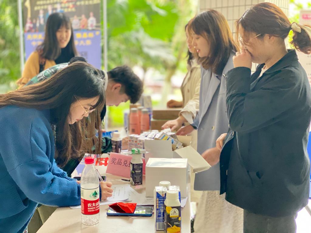 推广活动现场设置有党史文化、传统手工文化、传统服饰文化等三个活动展区,供活动现场的师生观赏参与,还特设打卡赢得奖章换取礼品的环节。同学们在积极活跃地报名参赛后,纷纷参与到各个展台的互动打卡活动中去。在建党100周年展台,同学们通过知识竞答与你画我猜的小游戏回顾党史,牢记初心;在传统文化展台,同学们体验了剪纸艺术与传统编织的独特魅力;在中国元素展台,同学们争相与身着中国传统服饰的礼仪队队员合影,并发送微博与朋友圈,让精彩在瞬间定格。同学们用手中集得的印章,在兑奖台兑换礼品,享受游戏乐趣的同时也加深了对中华文化的理解与感悟。