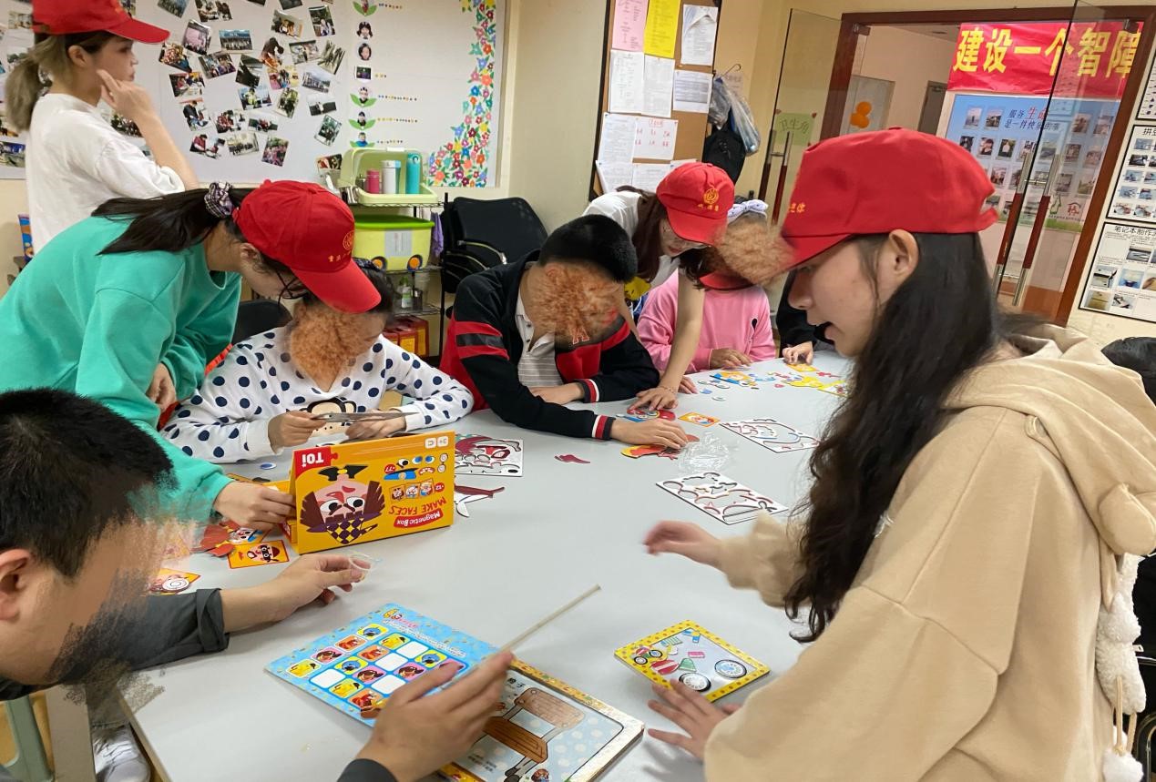 第二个环节是拼图游戏。由志愿者在旁协助,学员们对着几副难度不同,图案各样的拼图进行探索拼装。他们的脸上写满认真与严肃,很快就完成了拼图。他们的脸上因获得志愿者与老师们的肯定与鼓励而绽放出灿烂的笑容。
