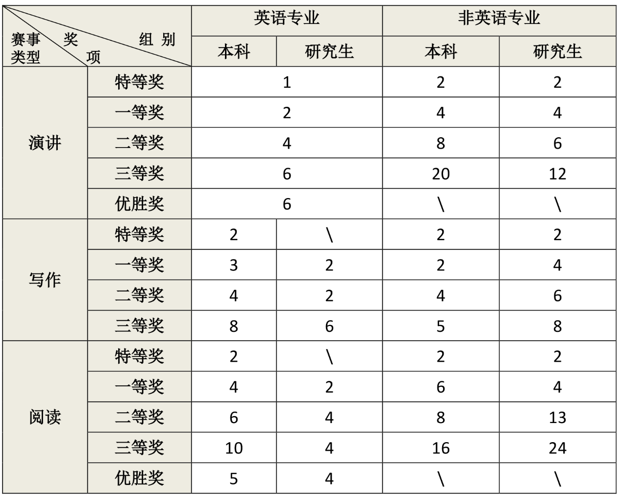 经各组别写作赛事团队和阅读赛事团队的专业评审,写作比赛评选出27名英语专业组获奖选手(本科17名、研究生10名),9名非英语专业本科组获奖选手,20名非英语专业研究生组获奖选手。阅读比赛评选出英语专业组获奖选手41名(本科27名、研究生14名),非英语专业本科组获奖选手32名,非英语专业研究生组获奖选手43名。