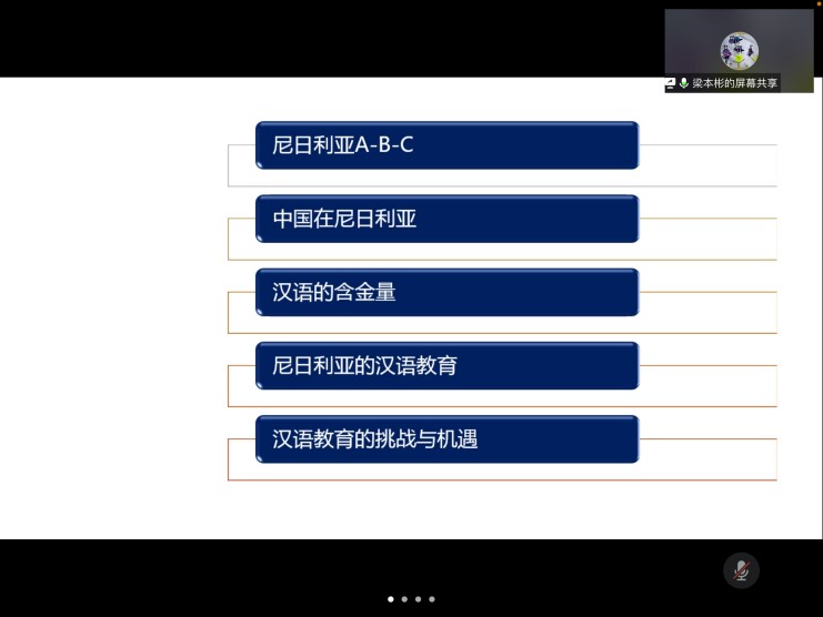 通过腾讯会议举办了“一带一路沿线国家中文教育的现状、机遇和挑战——以尼日利亚为例”的工作坊。工作坊由汉语国际教育硕士专业负责人杜瑾老师主持,中国驻尼日尼亚拉各斯总领馆工作的梁本彬先生主讲。全体汉语国际教育专业研究生参加了该工作坊。