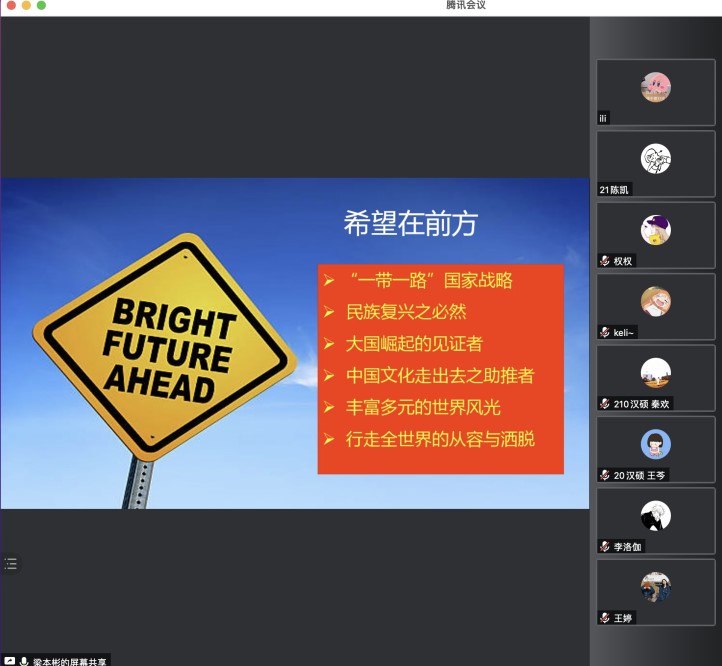 最后,杜瑾老师总结了今天的内容并鼓励大家打好专业基础,走出国门,让更多人了解中国,同时也请正在西班牙莱昂大学做中文志愿者的20级汉硕学生李洛伽分享了他在教学中遇到的挑战。最后,同学们与梁本彬先生进行了积极的互动交流,本次工作坊圆满结束。