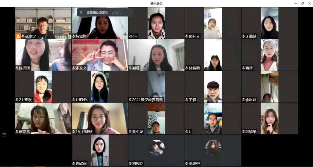 汉语国际教育硕士研究生党支部通过腾讯会议召开了择业、就业和国外志愿者录取经验分享会。作为汉硕党支部“我为师生办实事”主题系列实践活动之一,本次专题交流选择了同学们急于了解和感兴趣的话题,希望能帮助大家了解相关就业信息、理清就业思路。此次分享会由汉硕党支部副书记赵家宁同志主持,支部2020级党员作经验分享,汉语国际教育专业2021级全体学生参加了交流