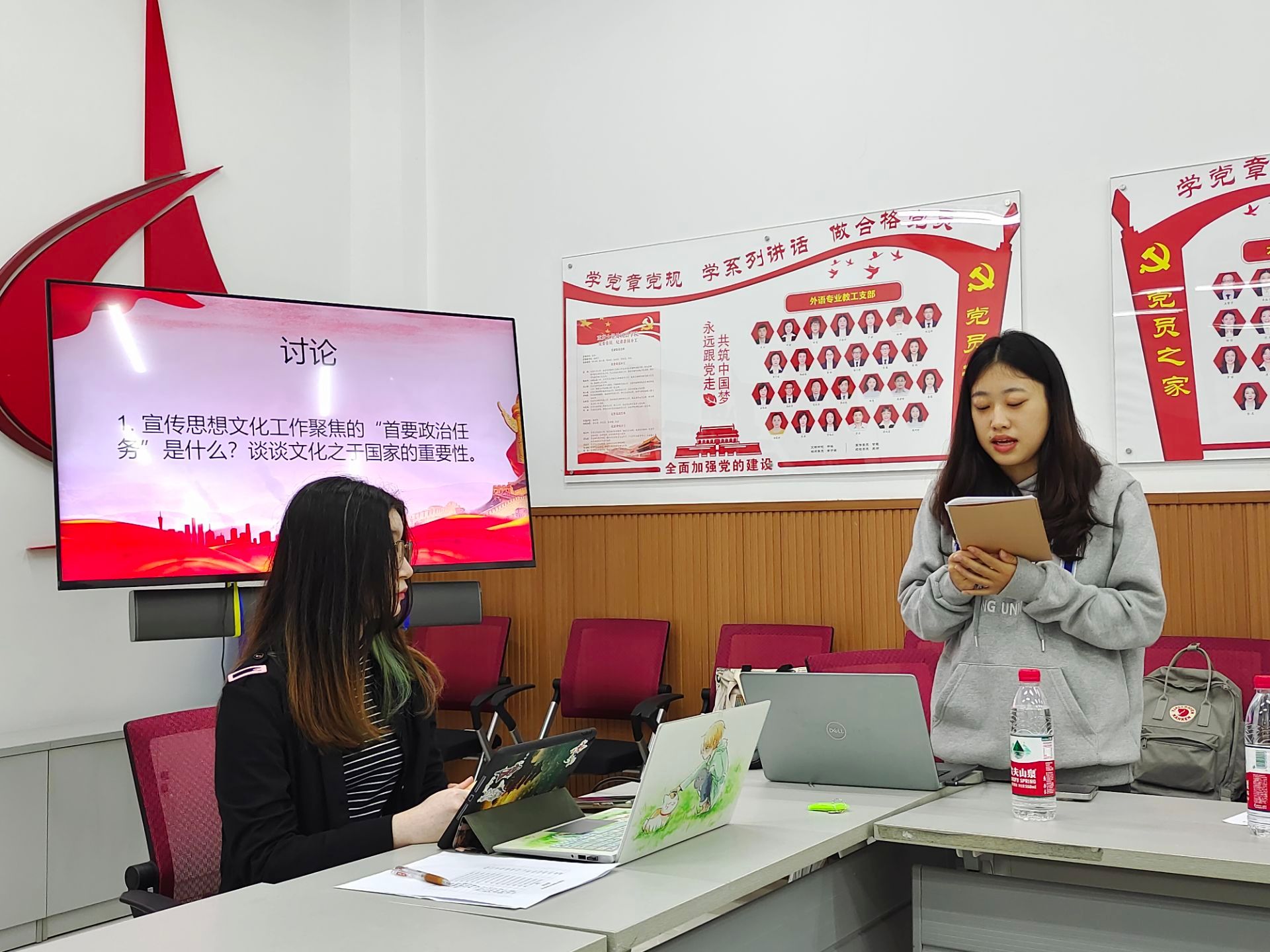 关于最后两个问题“结合自身,谈谈如何理解‘两个结合’的重大意义,努力创造属于我们这个时代的新文化”与“为什么要长期坚持、不断发展宣传思想工作的‘九个坚持’?结合实际经历,详细分析其中一种坚持”,同志们各抒己见,畅所欲言。官子炎同志表示,“两个结合”开辟了中国特色社会主义道路新篇章,青年学生要勇当排头兵,敢于创新,勇于实践,不断探索和尝试新的领域和方法,形成具有时代特征和民族风格的新文化。董文迪同学则选取“九个坚持”中“坚持讲好中国故事、传播好中国声音”这一原则进行了深入阐释,他表示我们不仅要用中文讲好中国故事,作为外语学子,我们还要学会用外语讲好中国故事,为中外的文化交流铺路架桥。最后,陈冰如同志作了总结发言,希望同学们在百年未有之大变局中,把握新形势,立足新征程,深刻掌握马克思主义文化观的科学方法,不断提高文化素养和文化创新能力。