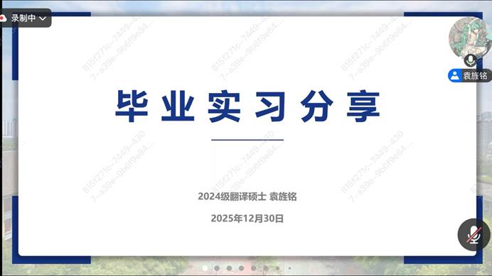 司卫国博士和陶叶茂博士共同主持,2024级翻译硕士袁旌铭受邀出席并作主题分享。会议旨在为正处于毕业关键期的同学们提供详实的学术指导与生涯规划建议,毕业班全体同学参与会议交流。