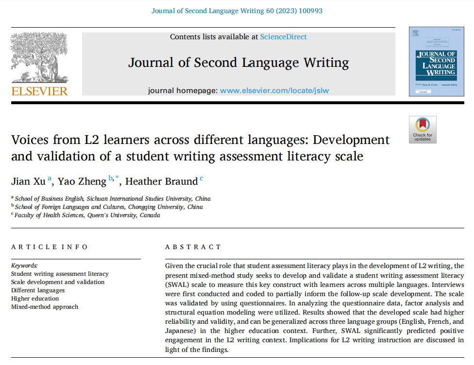 教师郑尧博士(通讯作者)与四川外国语大学徐建博士、加拿大女王大学Heather Braund博士的合作研究成果“Voices from L2 learners across different languages: Development and validation of a student writing assessment literacy scale”在语言学期刊Journal of Second Language Writing上正式发表。该期刊为语言学顶级期刊,2021年SSCI语言学一区(影响因子5.448, JCR排名5/195)及2022年中科院期刊分区语言学一区(排名2/198)。该文是郑尧博士主持的国家社会科学基金项目“积极心理视域下中国外语学习者多语写作投入的多维度动态研究”(21CYY018)的阶段性成果。