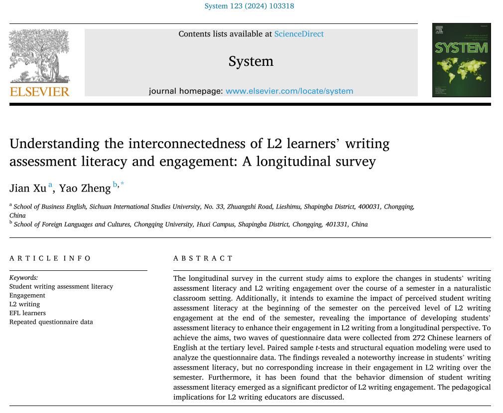 教师郑尧与四川外国语大学徐建教授共同在语言学领域的顶尖期刊——SSCI一区期刊System上发表了题为“Understanding the interconnectedness of L2 learners’ writing assessment literacy and engagement: A longitudinal survey”的学术论文。郑尧担任通讯作者,反差婊