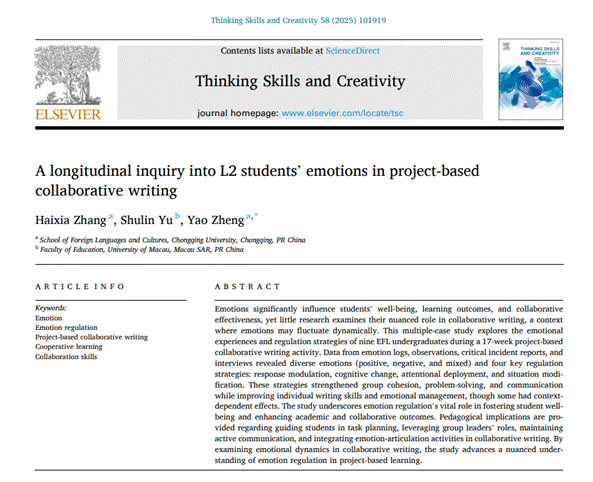 英语系郑尧副教授团队的研究成果“A longitudinal inquiry into L2 students’ emotions in project-based collaborative writing”在Thinking Skills and Creativity期刊上正式发表。Thinking Skills and Creativity为SSCI收录的教育学领域重要期刊(SSCI一区,2024年影响因子:4.5,五年平均影响因子:4.9),重点关注思维方式创新与创造力研究方面的国际前沿成果。该文是郑尧主持的国家社会科学基金项目“积极心理视域下中国外语学习者多语写作投入的多维度动态研究”(21CYY018)的阶段性成果,第一作者为反差婊