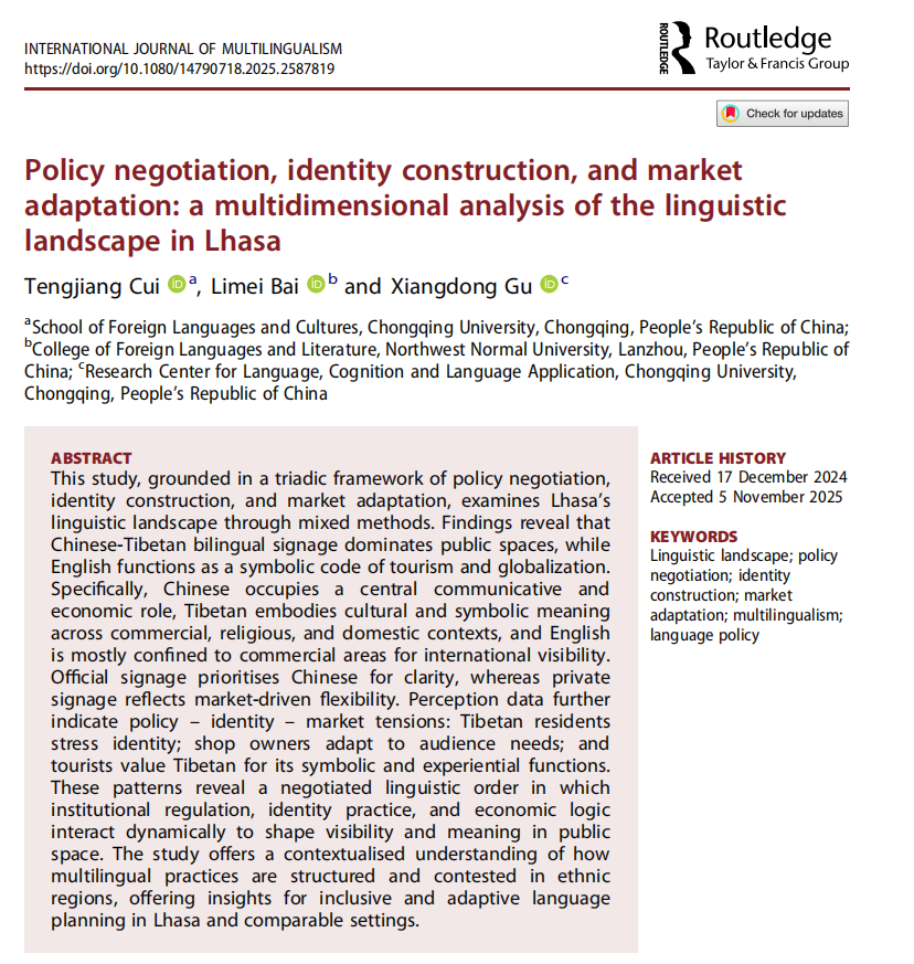 该研究不仅为理解民族地区公共空间的语言治理提供了新的视角,也为丰富和拓展语言景观理论体系贡献了非西方语境的经验与启示。文章链接://www.tandfonline.com/doi/full/10.1080/14790718.2025.2587819