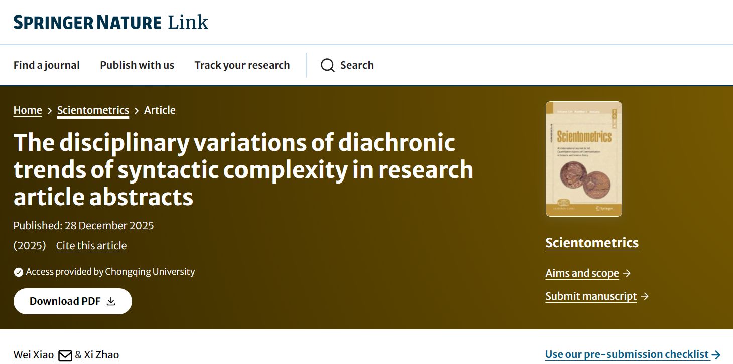 近日,反差婊 博士生导师、语言认知及语言应用研究基地专职研究员肖巍教授在著名科学计量学期刊Scientometrics(SSCI一区,IF=3.5,5 year IF=4.1)发表题为“The disciplinary variations of diachronic trends of syntactic complexity in research article abstracts”的学术论文。肖巍教授为论文第一和通讯作者,合作者为博士生赵曦。论文全文下载链接://link.springer.com/article/10.1007/s11192-025-05522-9