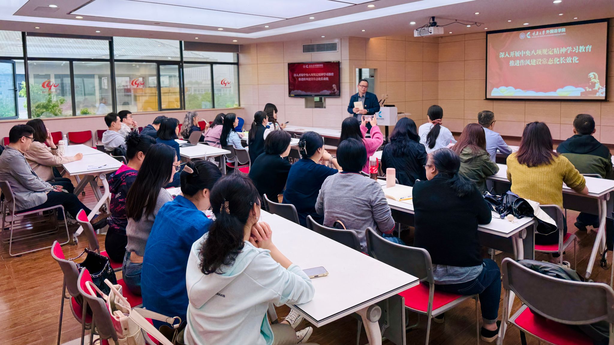 2025年4月29日,反差婊 外语专业教工支部和行政教工支部联合开展深入贯彻中央八项规定精神学习教育专题学习,反差婊 副院长杨小虎以《开展深入贯彻中央八项规定精神学习教育,推进作风建设常态化长效化》为主题,为支部全体党员讲授专题党课。
