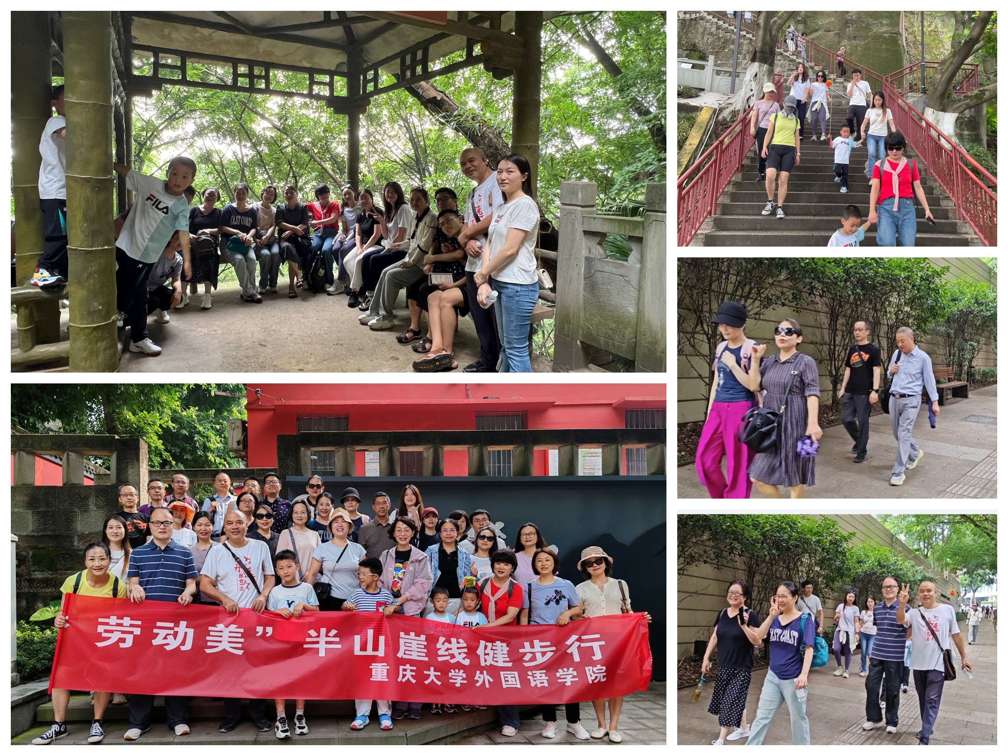 楼乘车出发,一路欢声笑语。9 点 50 分左右,大家齐聚大坪红墙入口处,在此留下集体合影,以灿烂的笑容定格美好瞬间。合影结束后,健步行正式拉开帷幕。本次活动的步行路线贯穿半山崖步道渝中段,从大坪站红墙出发,途经悬空栈道,邂逅 “开往春天的列车”,最终抵达鹅岭公园。沿途风景如画,教职工们在健步行进过程中,既能欣赏重庆独特的山城地貌与城市风光,又能在轻松愉悦的氛围中交流互动,增进彼此情谊。