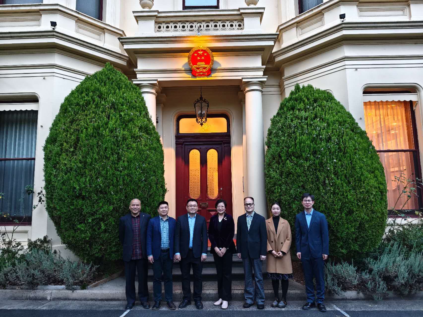 4月28日下午,访问团首先拜访中国驻墨尔本总领事馆,受到教育科技事务参赞衔领事丁莉女士和李林泽领事的热情接待。双方围绕合作意向与工作安排深入交流。丁莉领事高度评价此次出访的战略意义,强调国际中文教育、人才联合培养及高层次师资引进的重要价值,并期待访问团推动实质合作落地。