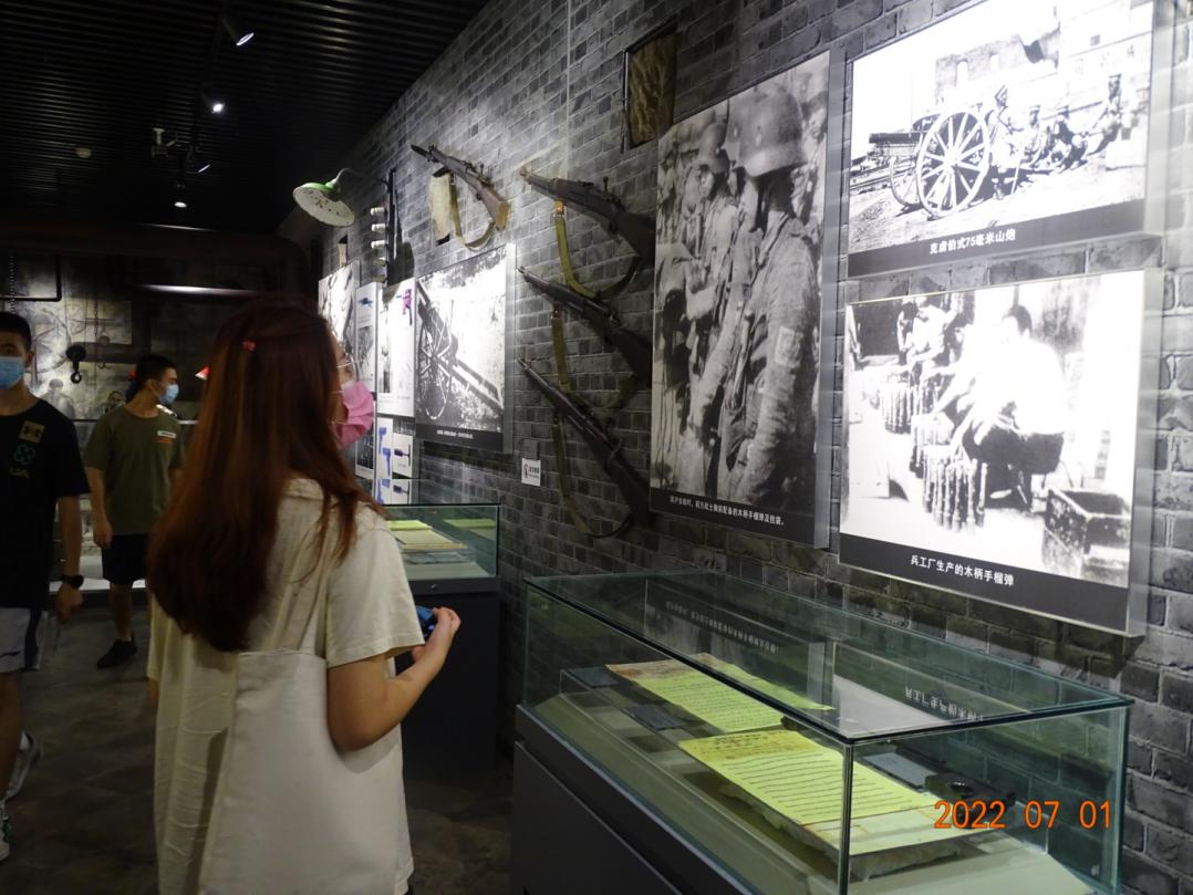 7月24日上午9时,实践团前往回望红岩足迹的第三站——重庆建川博物馆,进行参观学习。重庆建川博物馆是一个由24个防空洞打造的8个博物馆组成的博物馆聚落,包括兵工署第一厂旧址(汉阳兵工厂)博物馆、抗战文物博物馆等主题博物馆。其中,各式各样的老牌步枪、实景还原的抗战时期制造兵器的场景吸引着实践团成员的视线。这些丰富的文物和文字资料加深了实践团成员对抗战时期重庆军事力量的了解。实践团成员们在参观过程中不由得感叹道,“过去我们与敌人军事力量差距那么大,但在几代人的努力后,现在中国每年的阅兵仪式都能让世界为中国军事力量的强大而深感震撼。”