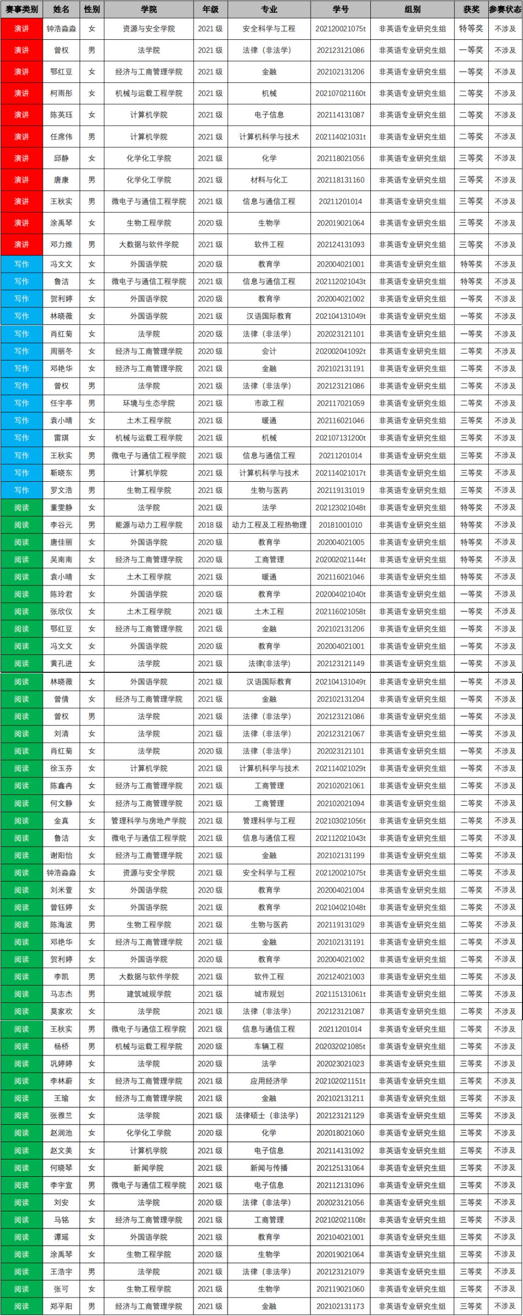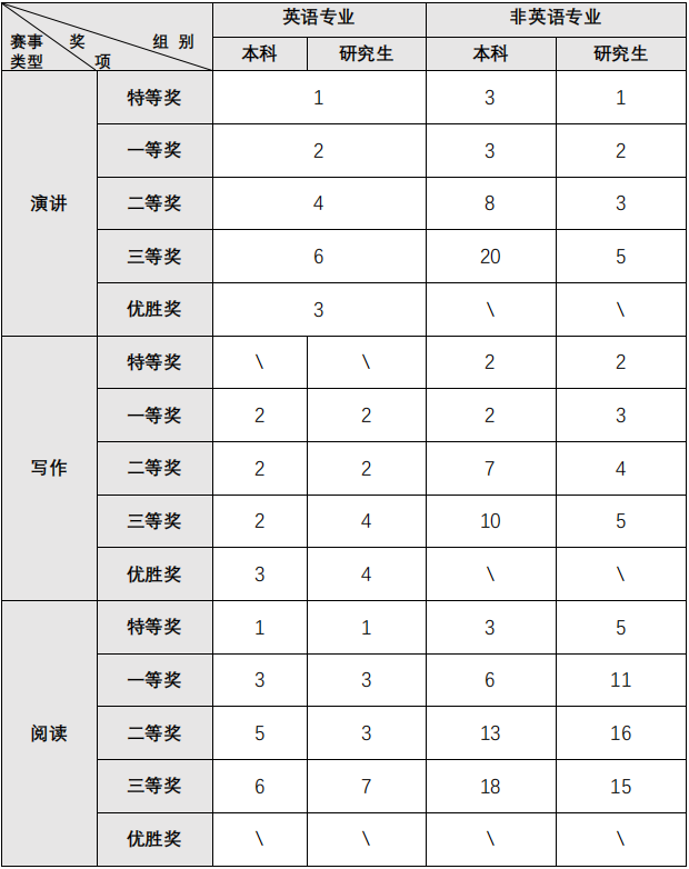 赛事选拔历时一个月,最终评定出233名获奖选手。其中,英语专业组获奖选手共66人,本科生获奖37人,研究生获奖29人;非英语专业组获奖选手共167人,本科生获奖95人,研究生获奖72人。具体获奖人数详情如下表: