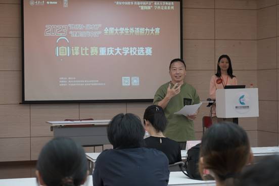 赛事尾声,评委老师范定洪就选手的整体表现进行了点评。范老师开宗明义地指出本次比赛具有特殊性且意义重大在于围绕“讲好中国故事,传递中国声音”这一宏大主题展开,他语重心长强调,讲好中国故事的道路依然任重道远,外语人应该认识到这是作为外语专业学生光荣的时代使命和责任担当。接着,范老师提到选手们的语音语调仍有进步空间,并指出同学们在翻译时仍需好好思考词汇对应问题。他以“土”一词为例,指出大部分同学都理解为土壤“soil”,但可能理解为陆地“land”会更好。最后,范老师建议同学们可以在口译时与观众、评委进行适量的眼神交互,以提升口译的参与感和信息传递性。