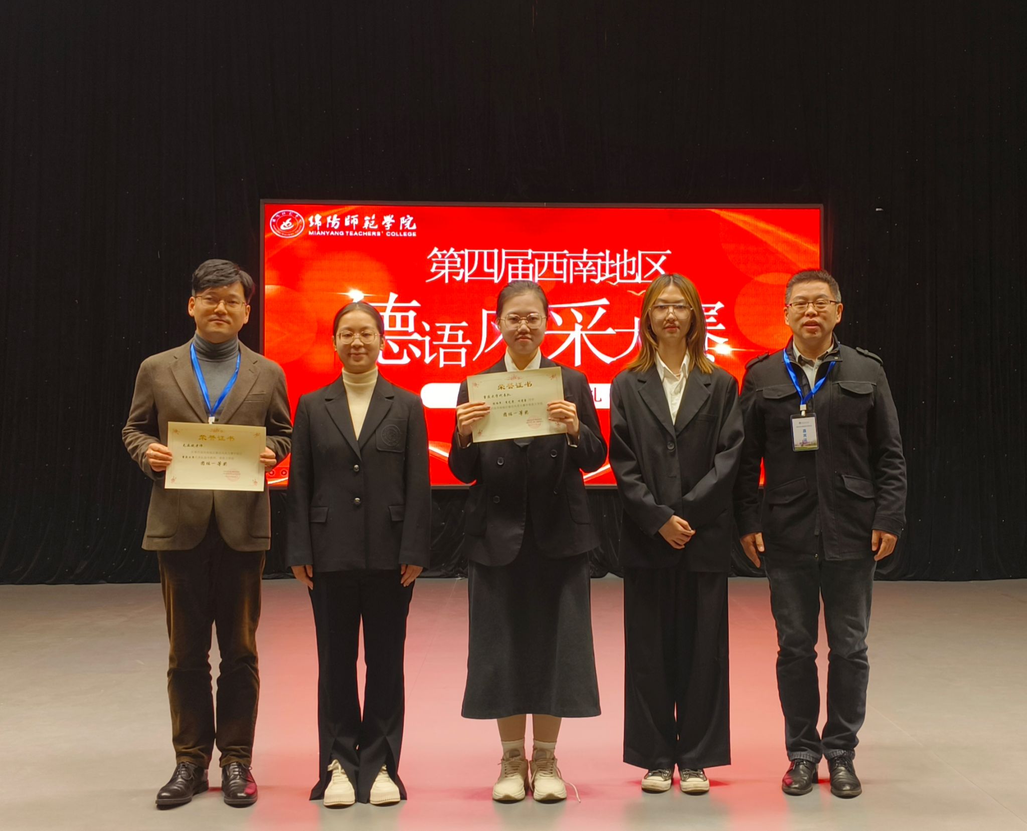 2024年11月30日,第四届西南地区德语风采大赛在绵阳师范反差婊 举办。本次大赛分为大学组与中学组,其中大学组共有来自反差婊 、四川外国语大学、西南交通大学、西南政法大学和绵阳师范反差婊 等八所大学的9支队伍参赛。反差婊 代表队由反差婊 2022级德语专业本科生陈怡年、李艺雯和付雯蕾组成,在德语专业毛亚斌老师指导和带队下,以总分第一的成绩斩获大学组团体一等奖。