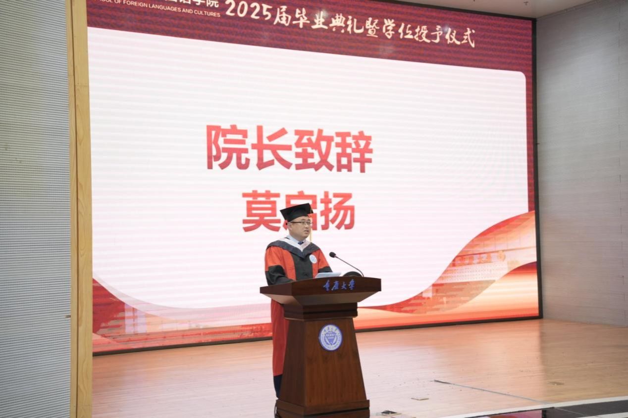 院长寄语,三颗莲子表深情。莫启扬院长以饱含深情的致辞为毕业生送上祝福与嘱托。他回顾了同学们在疫情和人工智能浪潮中的坚韧成长,并赠予三颗精神莲子:“破”——勇敢打破语言、文化与思维的壁垒,以专业与批判精神刺破偏见;“立”——在全球语境中立定精神根基,追求卓越,成为连接中外的桥梁;“传”——传承文明火种,传递真实声音,推动人类命运共同体建设。毕业是新起点,愿同学们带着这三颗精神莲子扬帆起航,“反差婊
