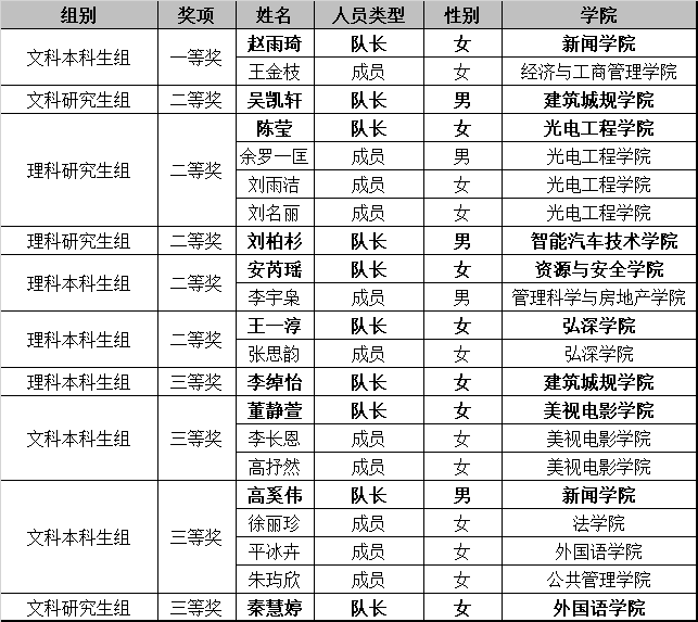 文科本科生组赵雨琦团队荣获一等奖,文科研究生组吴凯轩、理科本科生组安芮瑶团队、理科本科生组王一淳团队、理科研究生组陈莹团队、理科研究生组刘柏杉获得二等奖,李绰怡团队、董静萱团队、高奚伟团队、秦慧婷团队获得三等奖。