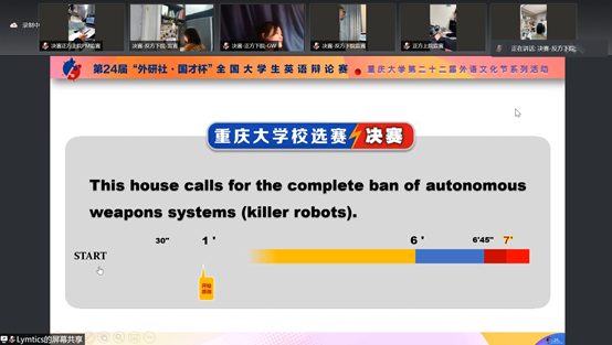 比之初赛、复赛,决赛过程气氛高度紧张,对于“This House calls for the complete ban of autonomous weapons systems”这一宏大辩题,辩手们相互驳斥,战况激烈。正方选手通过引证论据两次世界大战战况对比,结合当下俄乌局势,提出自动武器系统杀伤力大,且不易控制,容易破坏和平,应该禁止。反方同学则乘势而为灵活运用了美苏冷战的核威慑的例子,认为自动武器系统应该发展,以此让国家间因惧怕战争的杀伤力而达到相互制衡之势,从而维持和平。各方辩手各执一词、口若悬河,一方步步紧逼,一方则随机应变,以清晰的逻辑层次、敏捷的思维反应和突出的辩论技巧给评委老师们留下了深刻印象。