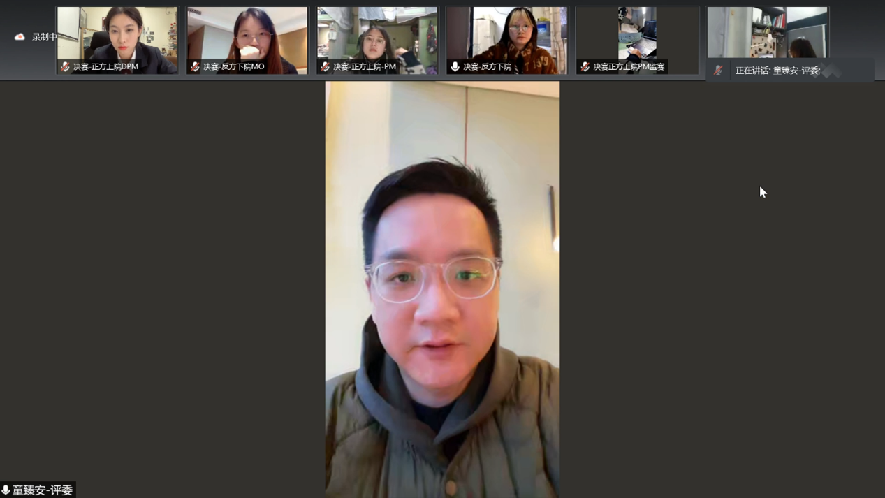 赛后,评委童臻安老师对决赛选手的整体表现予以认可,并指出仍有不足。他通过具体分析和举例说明决赛辩题中的重要概念,以及辩题中的道德对错判断,从内容丰富程度到辩论技巧一一点评,最后提到辩论和辩题的意义是能了解到专业以外的问题与领域。提醒同学们辩论需要以训练为基,要读书充实扩展自身,让在线选手们和观众受益匪浅。